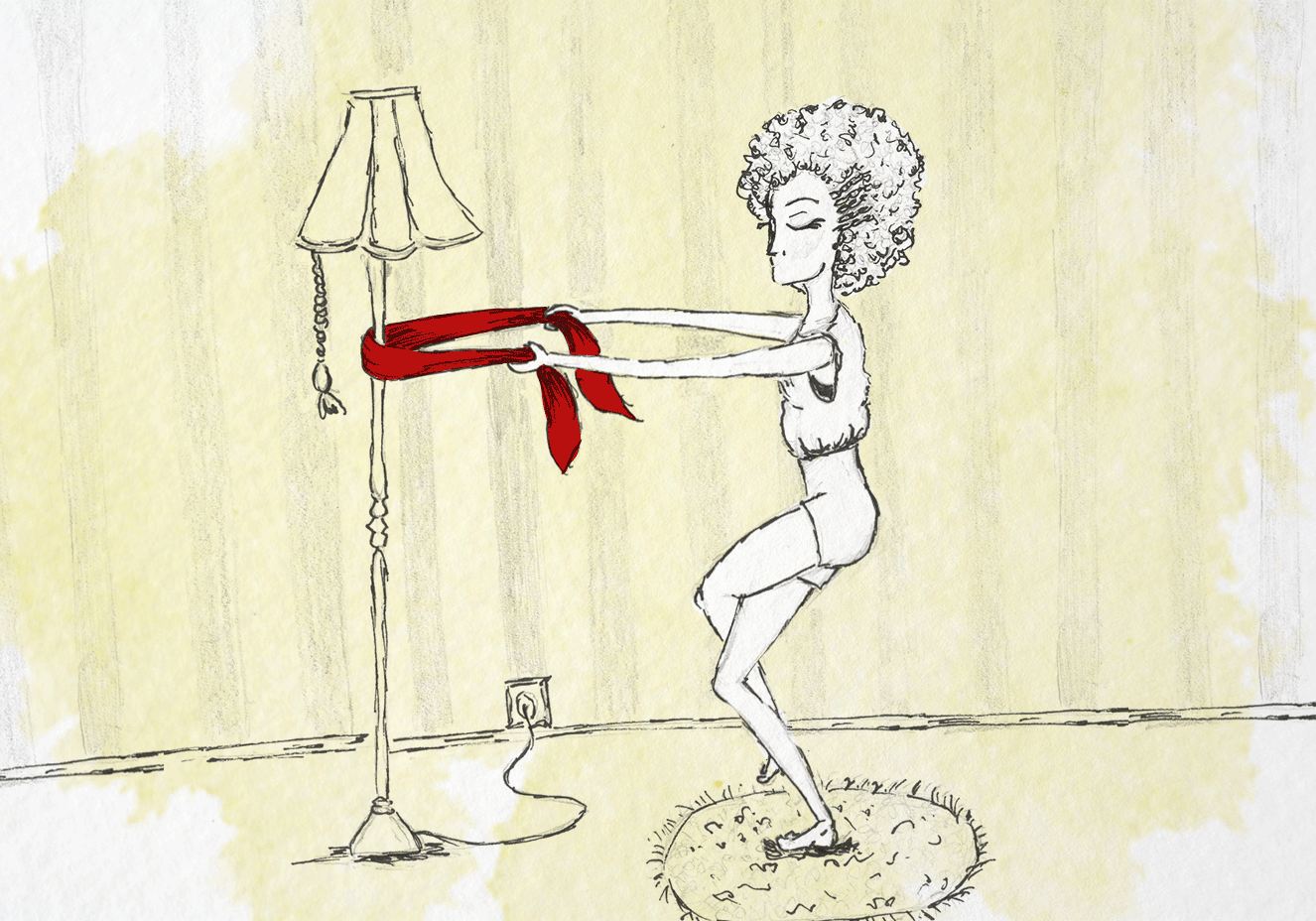 2. De novo com a fita presa em um ponto fixo da casa, enrole-a nos braços para dar apoio e depois cruze uma das pernas sobre a outra, ficando de um pé só. Como se fosse sentar em uma cadeira com as pernas cruzadas, repita o movimento de subir e descer dobrando o quadril, a parte do corpo que é trabalhada nesta rotina. A atividade também beneficia a musculatura posterior dos membros superiores.