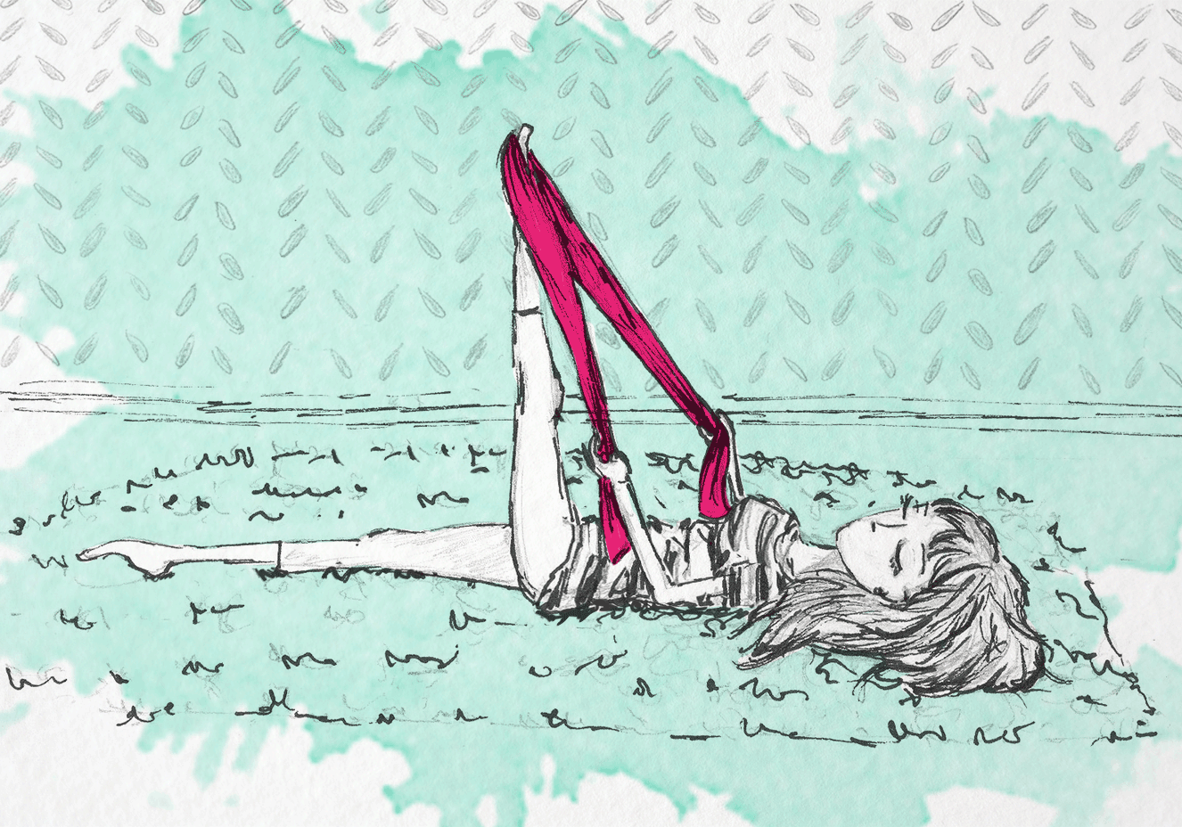4. Deitada de costas no chão, coloque a fita de alongamento por trás do seu pé esquerdo e a segure com as duas mãos. Erga a perna esquerda o mais alto que conseguir, sem dobrar os joelhos. Mantenha a posição por 20 segundos. Neste período, você sentirá a parte de trás da sua coxa sendo esticada. Depois troque de perna e faça o mesmo.